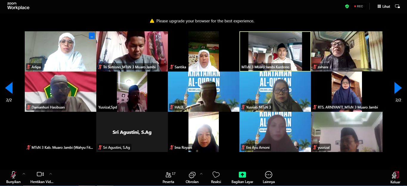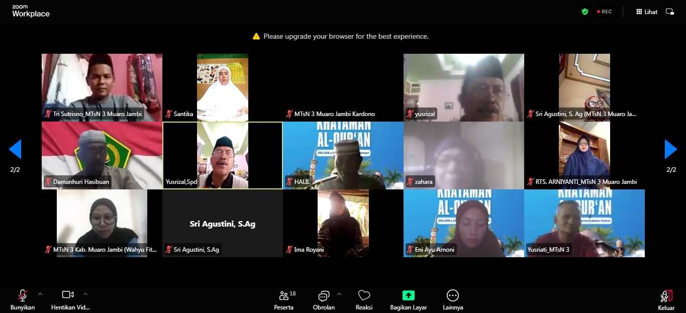 Muaro Jambi (Humas MTsN 3 Muaro Jambi) – Kepala Madrasah Tsanawiyah Negeri (MTsN) 3 Muaro Jambi, Bapak Kardono Z., secara resmi membuka kegiatan Khataman Al-Qur’an Nasional (MTsN 3 Muaro Jambi) yang diselenggarakan secara daring melalui platform Zoom pada Minggu, 16 Maret 2025. Acara ini merupakan bagian dari program nasional yang bertujuan untuk meningkatkan kecintaan terhadap Al-Qur’an serta mempererat ukhuwah Islamiyah di kalangan madrasah di seluruh Indonesia.