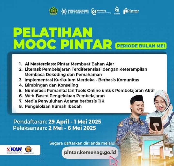 Pusat Pengembangan dan Penguatan Kompetensi (Pusbangkom) Kementerian Agama Republik Indonesia kembali menghadirkan Pelatihan MOOC PINTAR (Massive Open Online Course) untuk periode bulan Mei 2025. Program ini terbuka bagi para pendidik, tenaga kependidikan, dan pemangku kepentingan di lingkungan Kementerian Agama yang ingin meningkatkan kompetensi di berbagai bidang pendidikan dan keagamaan.